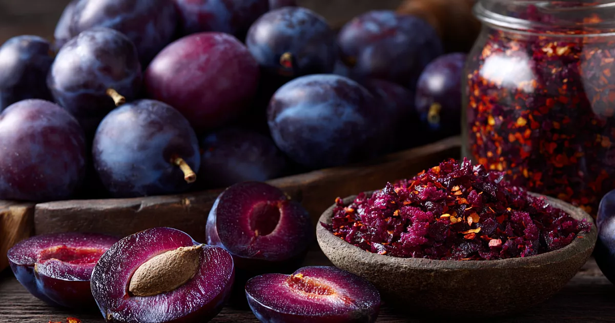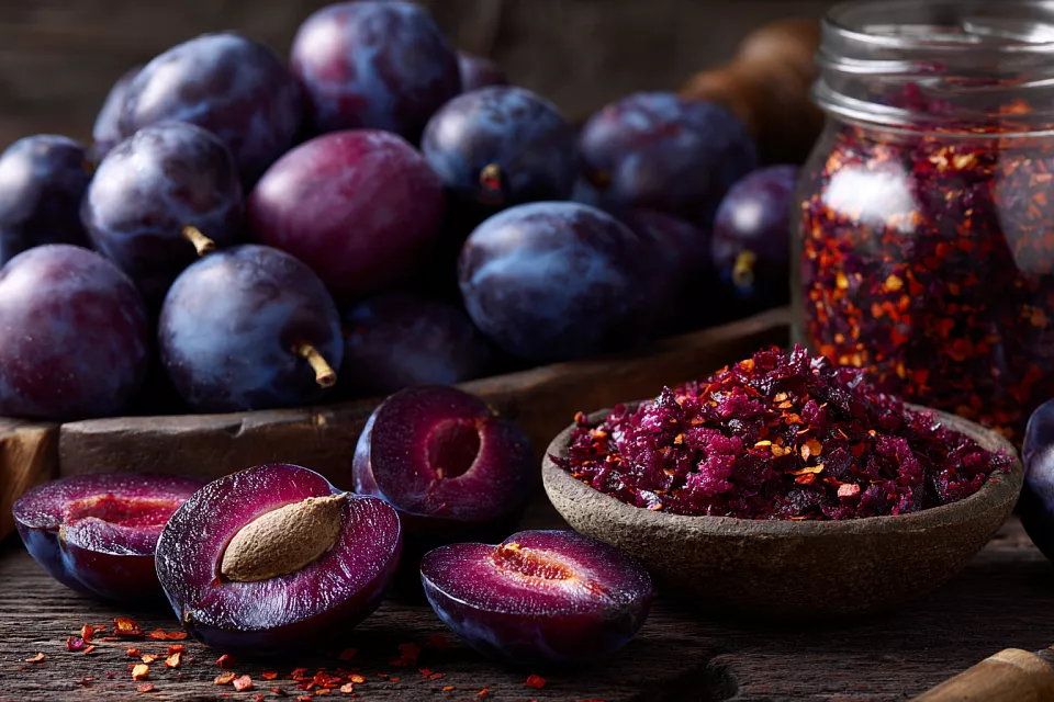 Приправа для мяса из слив. Ингредиенты: 1 кг плотной кисло-сладкой сливы, 50 г копчёной паприки. Промойте сливы в соляном растворе (1 ч. л. соли на 1 л воды), разрежьте пополам, удалите косточки, нарежьте тонкими пластинами. Сушите 16 часов при 50°C до хруста. Часть слив оставьте целыми для мясных рулетов, остальное измельчите в блендере. Смешайте 2 части сливы с 1 частью паприки. Храните в банке. Используйте для соусов, отбивных, тушёного мяса.