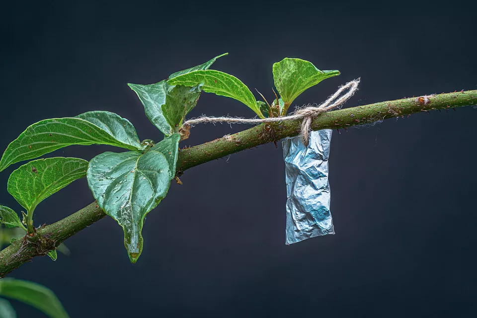 Как это работает: блестящая поверхность отражает солнечные лучи и создаёт хаотичные вспышки света. Для птиц и насекомых они выглядят как угроза и дезориентируют. Дополнительный эффект даёт лёгкий шелест и дребезг фольги на ветру — мягкий звуковой сигнал, который также отпугивает нежеланных гостей.