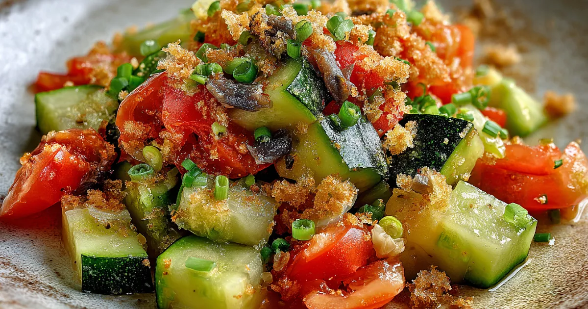 Ингредиенты: 1 средний кабачок, 2–3 стебля сельдерея, 1 помидор, 4 филе анчоусов, 2 зубчика чеснока, 30 г сливочного масла, щепотка копчёной соли, чёрный перец, пучок зелёного лука, горсть чесночных сухариков.