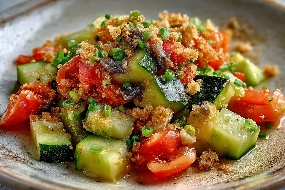 На сковороде растапливают сливочное масло — Василий настаивает именно на нём для насыщенного вкуса. Кабачки обжаривают 3–4 минуты до лёгкой румяности, добавляют сельдерей и жарят ещё 1–2 минуты. Затем кладут мелко нарезанный чеснок и 4 филе анчоусов. Анчоусы, по словам шефа, можно заменить мелко нарезанной килькой или воблой для бюджетного варианта. В конце добавляют помидоры, чёрный молотый перец и, если есть, копчёную соль для аромата. Готовое блюдо посыпают зелёным луком и чесночными сухариками, измельчёнными в крошку, для хруста.