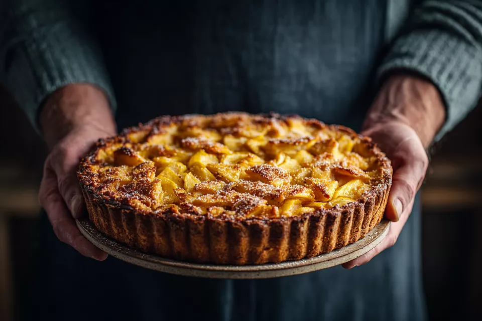 Выпечка. Форму ставят на противень, чтобы избежать протекания, и выпекают при 180 °C 40 минут. Готовый пирог — золотистый, с хрустящей корочкой, плотный и сочный, с ярким ароматом яблок и корицы. «Он идеально домашний, а с шариком мороженого — просто шедевр!» — радуется блогер. Пирог подают прямо в форме для уюта.