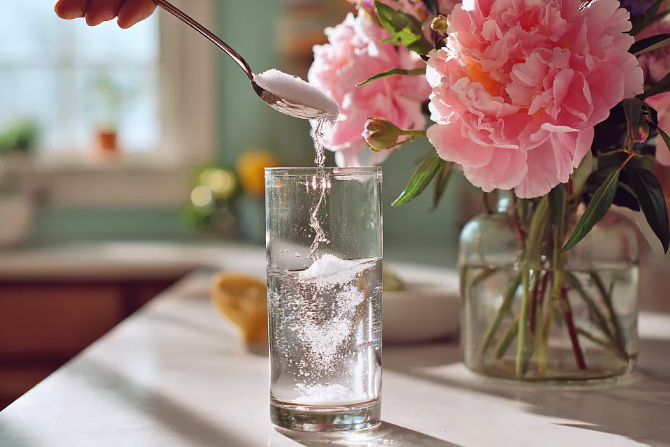 Подготовьте стебли. Срежьте низ под углом 45° острыми ножницами — так площадь всасывания воды больше. Удалите листья на участке, который будет в воде. Листья в воде быстро гниют и портят раствор. В вазу пока не ставьте. К капле средства для посуды добавьте столовую ложку сахара и размешайте до полного растворения. Мыло сдерживает рост бактерий и убирает запах, сахар даёт цветам энергию и помогает дольше держать.