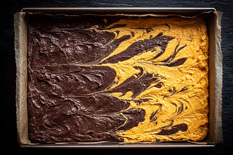 На противень, застеленный силиконизированной бумагой, выливают сначала светлую часть теста, затем распределяют шоколадную. С помощью вилки проводят узоры, чтобы при сворачивании получился эффектный рисунок. Бисквит выпекают при 170 °C около 25 минут без конвекции.