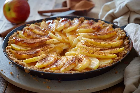Бюджетный яблочный пирог, который готовится на плите примерно за 35 минут. Внизу — нежные пряные яблоки, сверху — воздушное ванильное тесто.