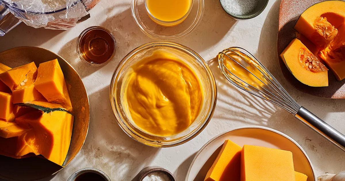 Берём тыкву (около 500–600 г), режем дольками (кожуру можно оставить), выкладываем в рукав для запекания. По желанию посыпаем 1 ст. ложкой сахара или мёда для сладости. Завязываем рукав, делаем отверстия для пара, запекаем при 200 °C 40 минут до мягкости. Отделяем мякоть от кожуры, измельчаем 400 г пюре блендером или через сито. Добавляем 2 ст. ложки мёда (по желанию), взбиваем до однородности. Пюре должно быть тёплым. В 100 мл апельсинового сока (процедить) замачиваем 10–15 г желатина на 10–15 минут. Растапливаем желатин импульсами в микроволновке, вливаем в пюре.
