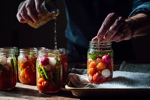 Размешайте соль и сахар до полного растворения и залейте банки доверху. Важно, чтобы овощи были покрыты жидкостью. Желательно оставить немного свободного места под крышкой, чтобы рассолу было куда «играть».