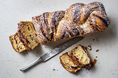 Особый шарм тут дают два момента: варенье из чёрной смородины с природным пектином — оно желирует и держит слой, — и сдобное тесто с хорошей долей сливочного масла и сахара. В итоге корочка выходит румяной и чуть хрустящей по краям, а мякиш — воздушным и влажным, без сухости. Варенье берите вкусное, но намазывайте тонко: так оно не вытечет и равномерно пропитает слои.