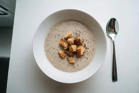 Набор здесь совсем простой — картофель, грибы и лук — а вкус получается по-настоящему осенний. Сначала немного прогреваю лук на растительном масле с кусочком сливочного, чтобы ушёл сырой привкус и появилась тёплая нотка. Следом добавляю грибы, даю им выпустить сок, потом коротко протушиваю с картофелем. В конце вливаю немного сливок и пробиваю блендером до шелковистой гладкости. Подача со свежими домашними сухариками сразу делает суп нарядным и ещё ароматнее.