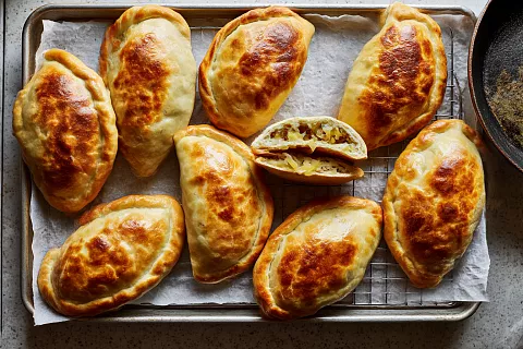 Пирожки с сочной капустной начинкой и эластичным тестом без яиц: заварка муки, быстрые дрожжи и бережная жарка на небольшом огне.