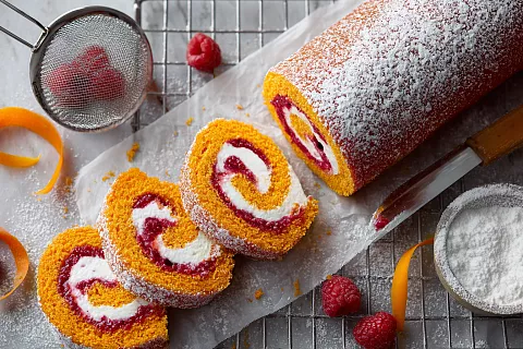 Морковный рулет с малиновым конфи и сливочным кремом