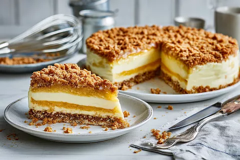 Форму диаметром 20 см застелите дно и бортики. Крошку разделите на 4 равные части, 2–3 ст. ложки отложите для посыпки. Удобно переложить крем в кондитерский мешок. На дно формы насыпьте первую часть крошки и разровняйте, выдавите слой горячего крема. Повторите ещё три круга: крошка — крем. Верх слегка прижмите, посыпьте отложенной крошкой. Накройте плёнкой «в контакт» и охладите 6–8 часов (лучше на ночь) до стабильного среза.
