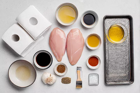Для маринада соедините в миске 3 ст. л. мёда, 2 ст. л. растительного масла без запаха, 2 ст. л. классического соевого соуса, 1 ст. л. уксуса (яблочного или винного), 1 ч. л. горчицы, 2 ч. л. сладкой паприки, 2 ч. л. молотого чёрного перца или смеси перцев, 1 ст. л. кисло-сладкого соуса и 3 мелко давленных зубчика чеснока. Всё тщательно перемешайте до однородности.