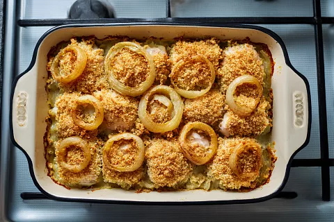 Для заливки в миску разбейте 3 яйца, добавьте 200 г сметаны или густого йогурта, 0,5 ч. л. соли, 1 ст. л. сушёного зелёного лука и молотый перец по вкусу. Всыпьте 3 ст. л. панировочных сухарей (примерно 60 г). Перемешайте венчиком до однородности. Благодаря сухарям заливка становится густой, ароматной и после запекания превращается в румяную «шубку» с интересным вкусом.