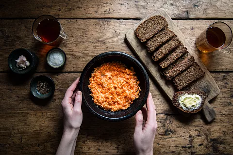 Гренки из чёрного хлеба с намазкой из сельди и корейской морковкой