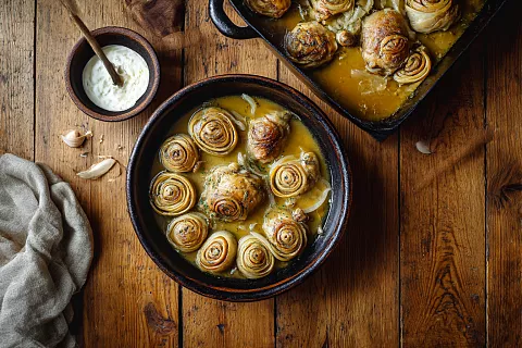 В конце курица становится очень мягкой, легко распадается на волокна, а рулетики полностью пропитываются луком и бульоном. На поверхности остаётся густой луковый соус. Подавайте блюдо горячим: на тарелку выкладывайте куриное мясо, несколько рулетов, поливайте луковым бульоном и добавляйте сметану.