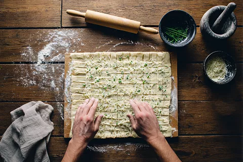 Получившуюся стопку постепенно раскатайте в большой пласт, время от времени проверяя, достаточно ли крахмала между слоями, при необходимости подсыпайте. Затем намотайте слоёную заготовку на скалку и слегка встряхните, убирая излишки муки или крахмала. Последний слой оставьте на столе.