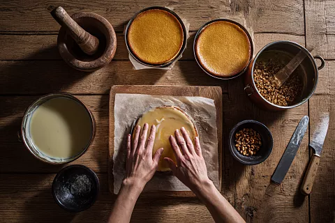 Этот торт готовится без грамма муки: коржи из молочного крема, румяная корочка и тонкий слой варёной сгущёнки с солёным арахисом.
