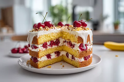 Медовый торт с бананом и вишней: нежный бисквит, сметанный крем за 1 час + пропитка