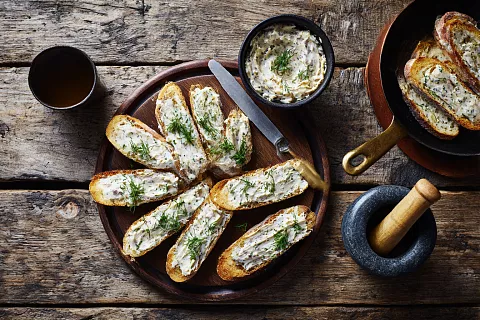 Параллельно поджарьте хлеб на сухой сковороде до румяной корочки. Выложите ломтики на тарелку и щедро намажьте ещё не совсем остывший селёдочный спред. Для завершения картины посыпьте мелко рубленым укропом.