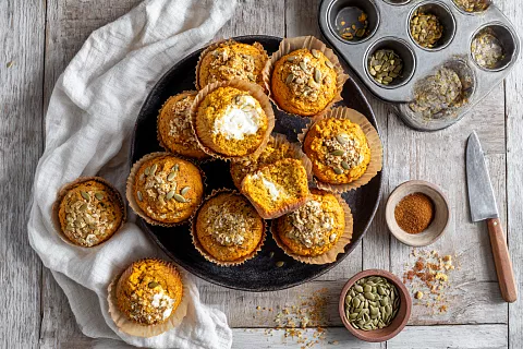 Спелая, сочная, оранжевая тыква сама по себе украшает стол, стоит недорого, а дачникам вообще достаётся бесплатно. И вот из этого солнечного овоща мы делаем двойное удовольствие: снаружи — мягкий пряный кекс, внутри — нежный чизкейк, сверху — хрустящие тыквенные семечки. Такие кексы легко улетают с тарелки один за другим.