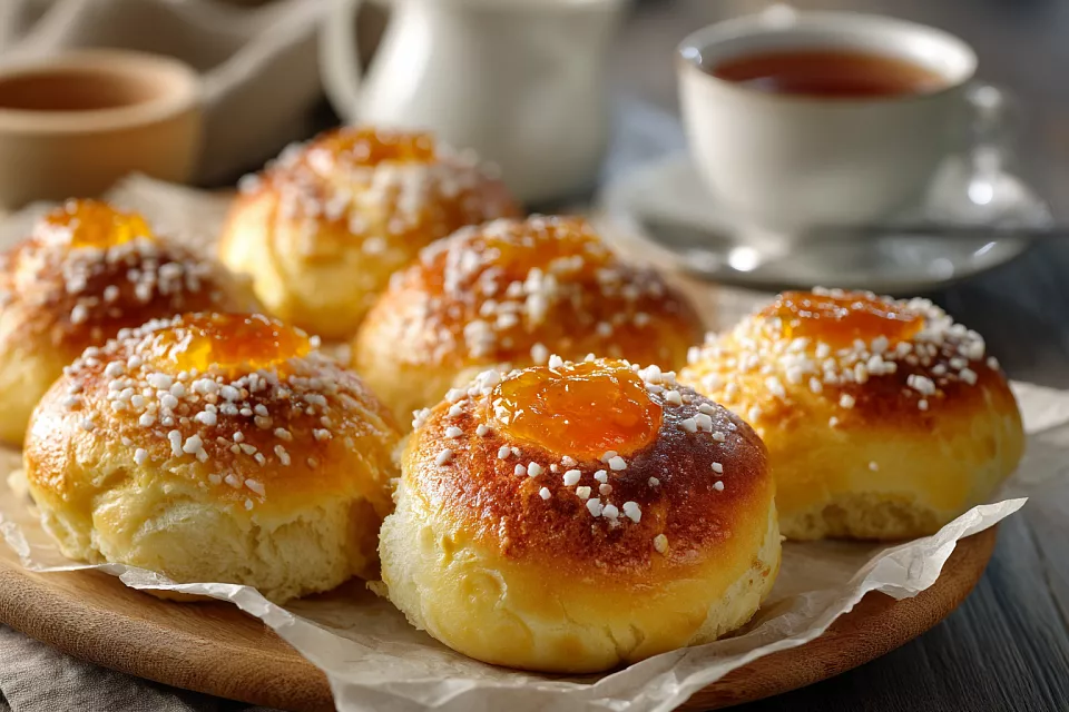 Делаем углубление пальцем, кладём абрикосовое варенье. Печём в разогретой до 180°C духовке (верх-низ) 20–25 минут до золотистости. Остужаем 10 минут. Совет: сода для воздушности. Лайфхак: липкое тесто – мягкие булочки.