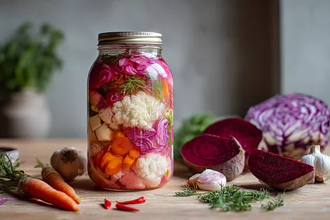 Белокочанная и цветная капуста, свекла, морковь, зелень, острый перец. Слоями в банку, заливаем тёплым рассолом – хрустящая, ароматная, с лёгкой остротой.