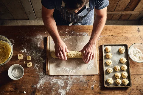 Шаг 13. Сформируйте из теста валик. Разделите его на 16 частей весом примерно по 50–55 г каждую, если хотите аккуратные одинаковые печенья. Размер можно менять на своё усмотрение.