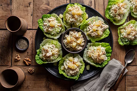 Лёгкий салат с курицей, ананасами, орехами и сыром на листьях айсберга выглядит по-праздничному, а готовится за считанные минуты.