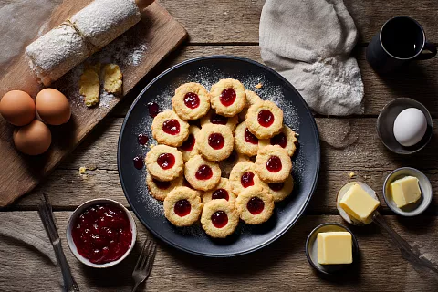 Я очень люблю эту выпечку за то, что она и нарядная, и по-домашнему простая. В Германии такие веночки пекут ящиками: держат в коробке, неспешно пьют чай, угощают гостей. Нравится, что марципан после запекания становится кремовым, не сухим, печенье долго не черствеет, а кислый джем уравновешивает всю сладость. Сформировал противень — и к празднику вы уже практически готовы.