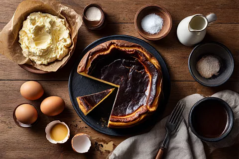 Приготовим знаменитый баскский чизкейк. Он делается даже проще классического: без основы, без водяной бани, всё в одной миске. Секрет — очень высокая температура и тёмная румяная корочка при нежной кремовой середине.