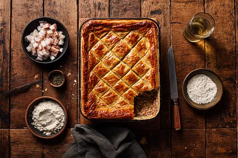 Шаг 8. Смешайте яичный жёлток с 1 столовой ложкой молока и смажьте поверхность пирога. Острым ножом сделайте неглубокие надрезы в виде ромбиков, прорезая примерно до половины толщины теста, чтобы не нарушить форму.