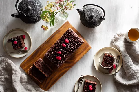 Шаг 8. Подготовьте глазурь. Растопите 200 граммов тёмного шоколада на водяной бане или в микроволновке короткими импульсами, каждый раз помешивая. При желании добавьте немного растительного масла, чтобы глазурь стала более текучей. Осторожно достаньте торт из формы, вылейте шоколад на верх и разровняйте тонким слоем лопаткой. Ещё раз охладите до застывания глазури.