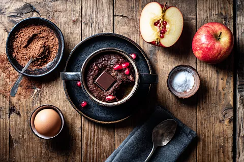 Этот шоколадный брауни из яблока готовится в микроволновке всего за три минуты и получается влажным, мягким и очень ароматным.