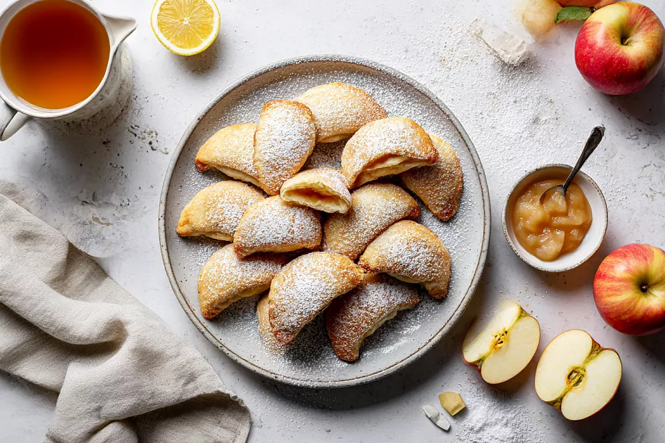 Это то самое печенье, которое исчезает со стола быстрее, чем успевает остыть. Творожное тесто получается нежным и мягким, а начинка — ароматная, яблочная, чуть карамельная. Готовится всё из самых обычных продуктов, без сложностей: замесили тесто, быстро припустили яблоки — и дальше только формовать рогалики