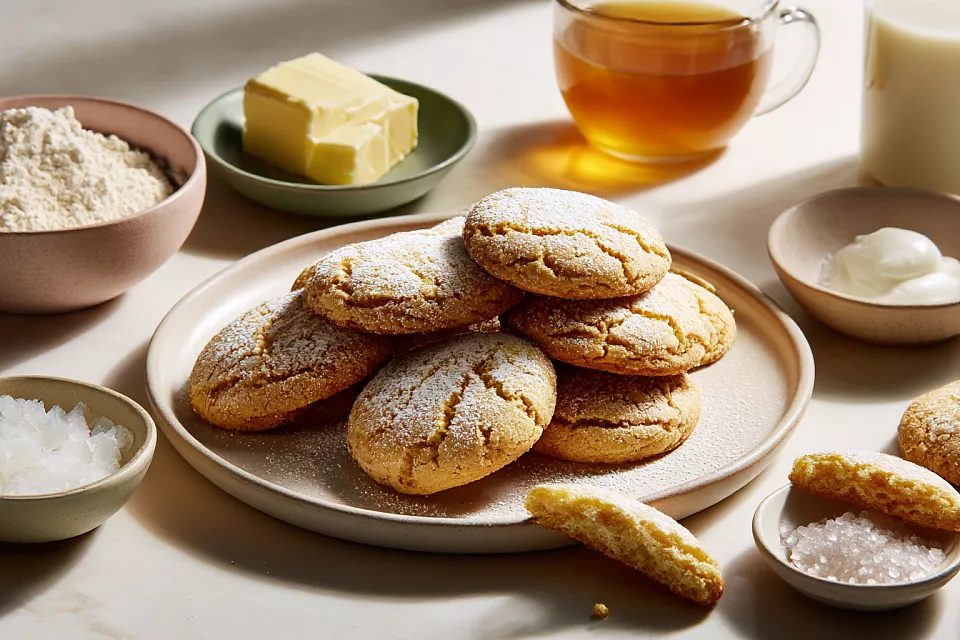 Выпекайте около 25 минут до золотистой корочки. Печенье получается мягким, слоистым и рассыпчатым, с красивыми трещинками сверху. Хранить его удобно в закрытом контейнере, так оно спокойно лежит несколько дней, а при желании можно припылить сахарной пудрой перед подачей.
