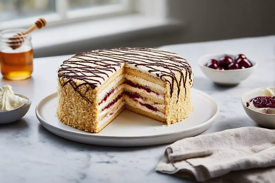 Если любите медовик, но не хотите возиться с раскаткой, этот вариант — находка: тонкие коржи из одного противня и сметанный крем с ягодной кислинкой.