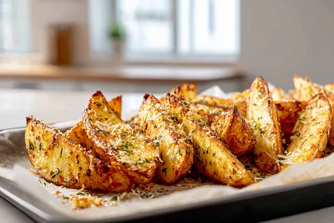 Выкладываем дольки на противень с пергаментом в один слой на расстоянии друг от друга. Отправляем в разогретую до 200 °C духовку (верх-низ или с конвекцией) на 20–25 минут до уверенной золотистой корочки. Готовность проверяем зубочисткой – внутри должна быть мягкость.