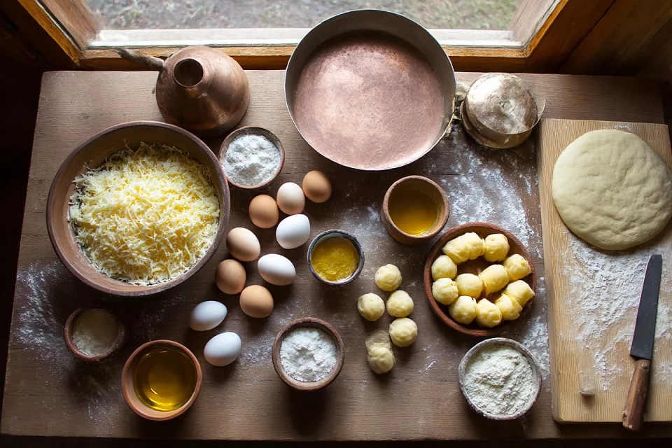 Для теста взбейте в миске три яйца с половиной чайной ложки соли и добавьте 50 мл воды комнатной температуры. Отдельно просейте муку, сначала 350 г, при замесе подсыпайте ещё до плотного, упругого теста, похожего на пельменное. Вымесите на столе 4–5 минут до гладкости, верните в миску и накройте плёнкой или полотенцем минимум на 10 минут, можно до получаса. Тем временем натрите на крупной тёрке имеретинский сыр и сулугуни, слегка подсолите начинку и накройте, чтобы не подсохла. Растопите сливочное масло, смешайте его с растительным и отставьте.