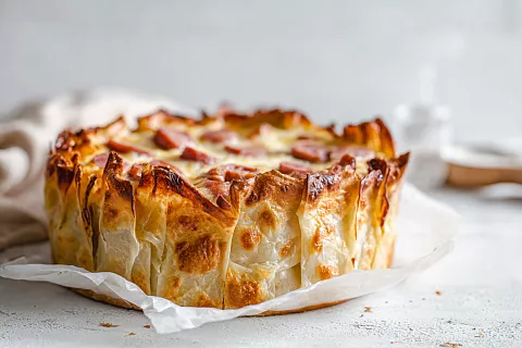 Румяный, тягучий, с копчёной колбаской и сырной корочкой – этот пирог-гармошка готовится быстрее, чем вы успеете сварить кофе.