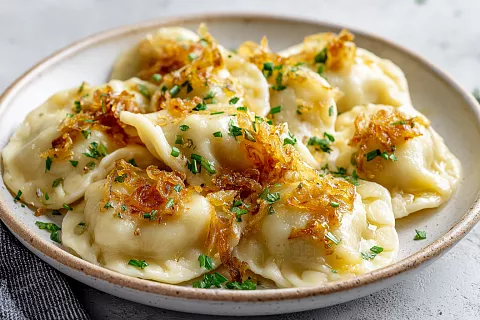 Классические вареники с пюре и золотистым лучком — сытно, вкусно и идеально для поста или праздничного стола.
