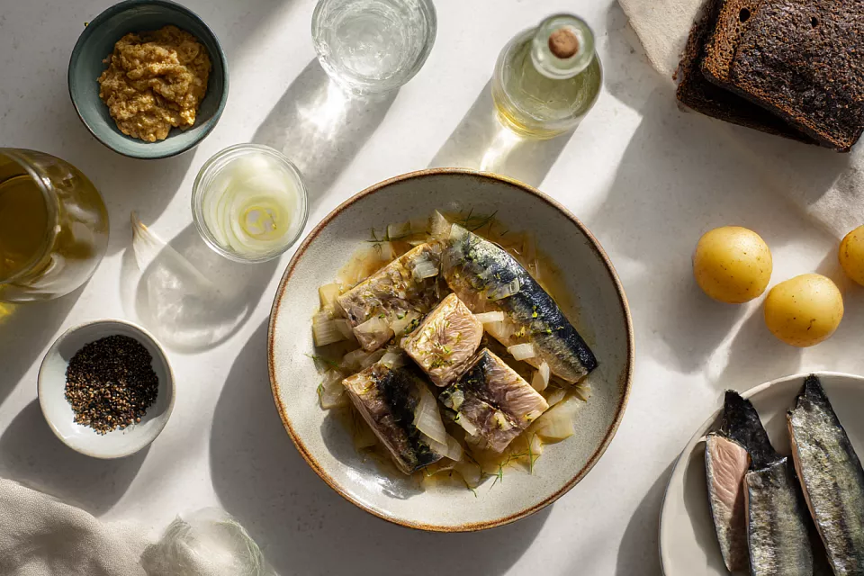 Двойной маринад (кислота + лук + горчица) делает свежую скумбрию полностью безопасной и невероятно вкусной уже через несколько часов.