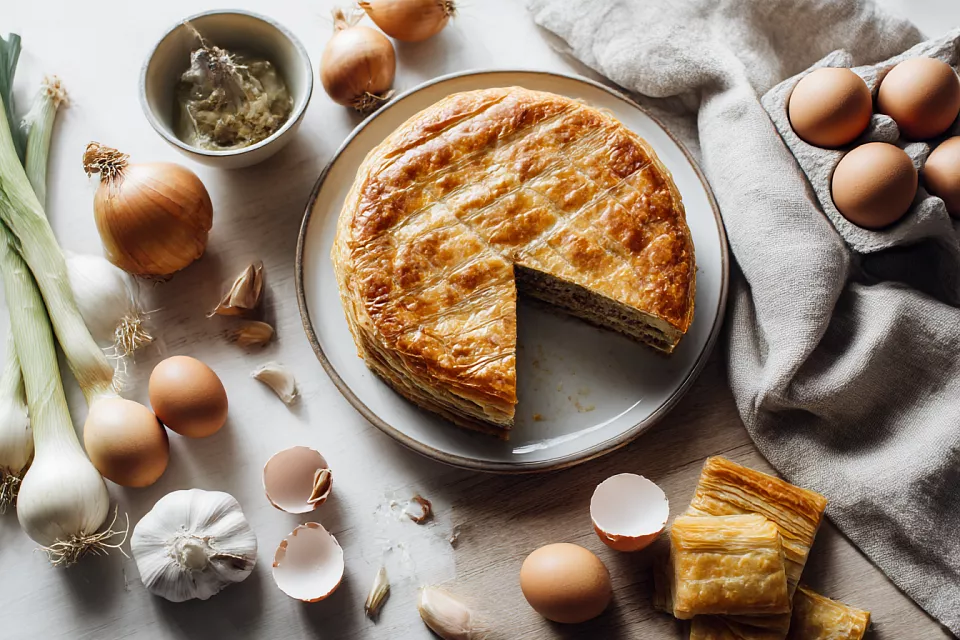 Слои хрустят, внутри шёлковый паштет из печени с карамельным луком, а сверху золотистая крошка и тёртый желток — гости ахают и просят добавки.