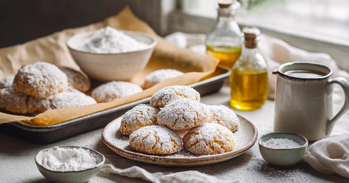 Нужна сахарная пудра. Если её нет, можно измельчить сахар погружным блендером или лучше кофемолкой. Обваляйте каждую заготовку со всех сторон в пудре и выложите на противень, застеленный бумагой для выпечки. Выпекаем в разогретой духовке при 180 °C 10–12 минут. Не пересушите: они должны слегка подрумяниться снизу и остаться мягкими.