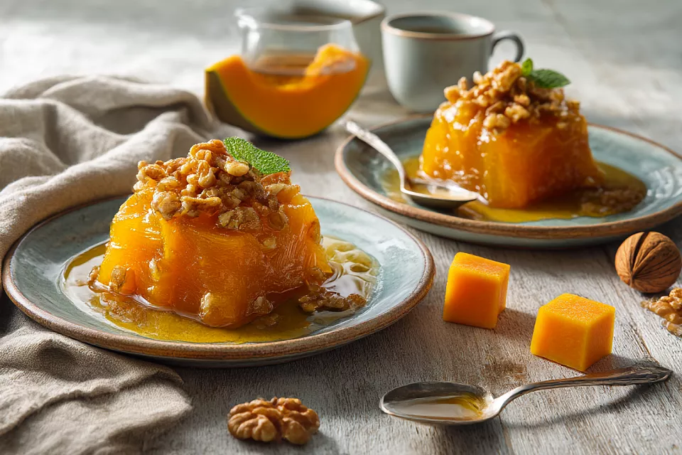 Нежная тыква в прозрачном сиропе, да ещё с орешками — это тот случай, когда «просто тыква» вдруг становится любимым десертом.