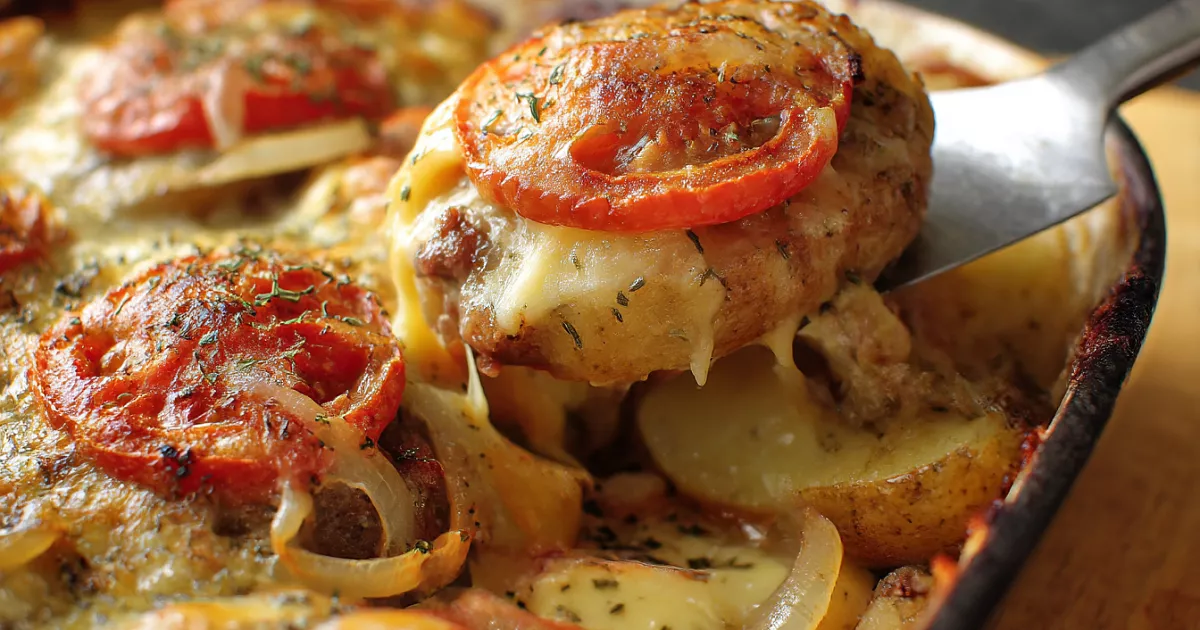 Мясо выходит сочным внутри, с аппетитной сырной корочкой, а картофель под ним пропитывается соками и становится невероятно вкусным.