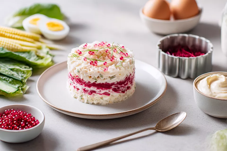 Шеф-повар Илья Лазерсон собирает крабовый салат слоями — и «классика» вдруг выглядит как маленький праздник