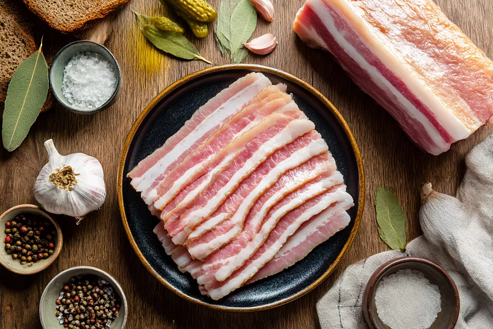 Рассол сначала коротко кипятится со специями, потом полностью остывает, и уже холодным заливает кусочки сала. Никакой сложной техники тут нет, но важны два момента: сало должно быть полностью покрыто рассолом, а сверху нужен небольшой гнёт, чтобы всё просолилось одинаково.