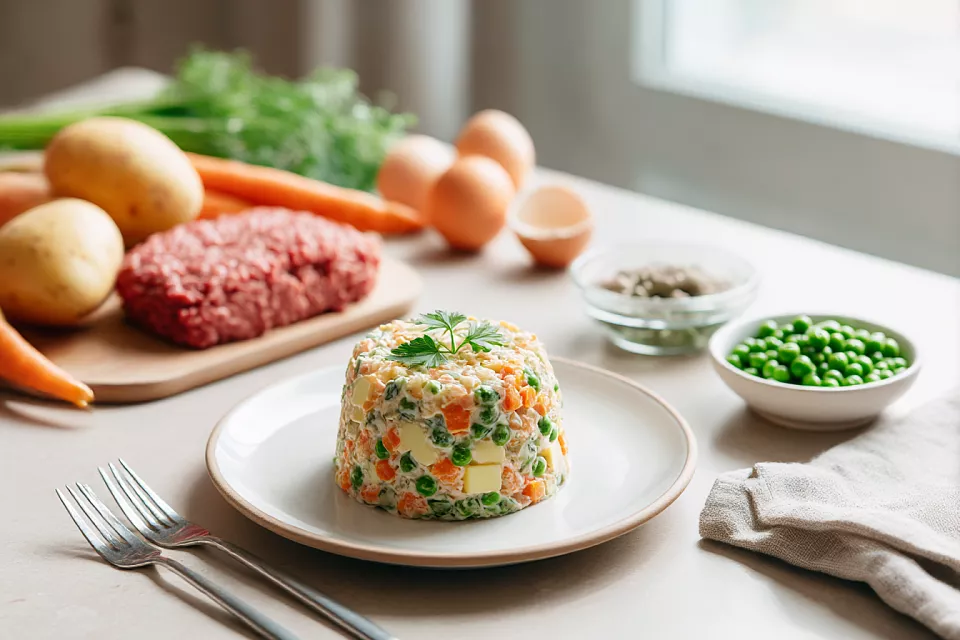 Не жалейте миску побольше — это реально спасает кубики. Огурцы натирайте и отжимайте: салат будет стоять дольше и останется свежим. Майонез добавляйте в два этапа, чтобы не сделать “майонезный суп”. А подать можно “официально”: утрамбовать в тарелочку-форму и аккуратно перевернуть, только не давите слишком сильно.