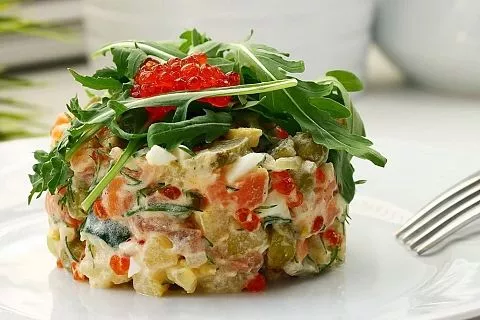 Для оливье с морепродуктами или красной икрой выбирайте домашний майонез, он деликатно оттенит, а не перебьет тонкий вкус даров моря.