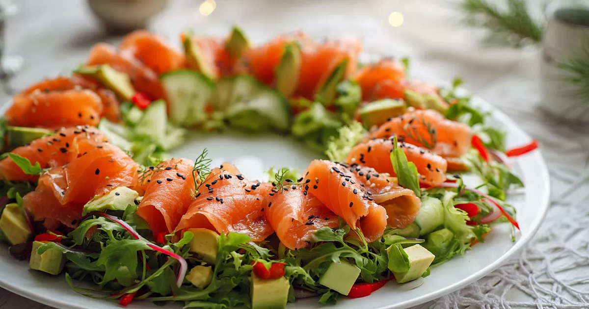 Этот лёгкий и элегантный салат с малосольной красной рыбой, авокадо и свежими овощами выглядит как праздничный венок.